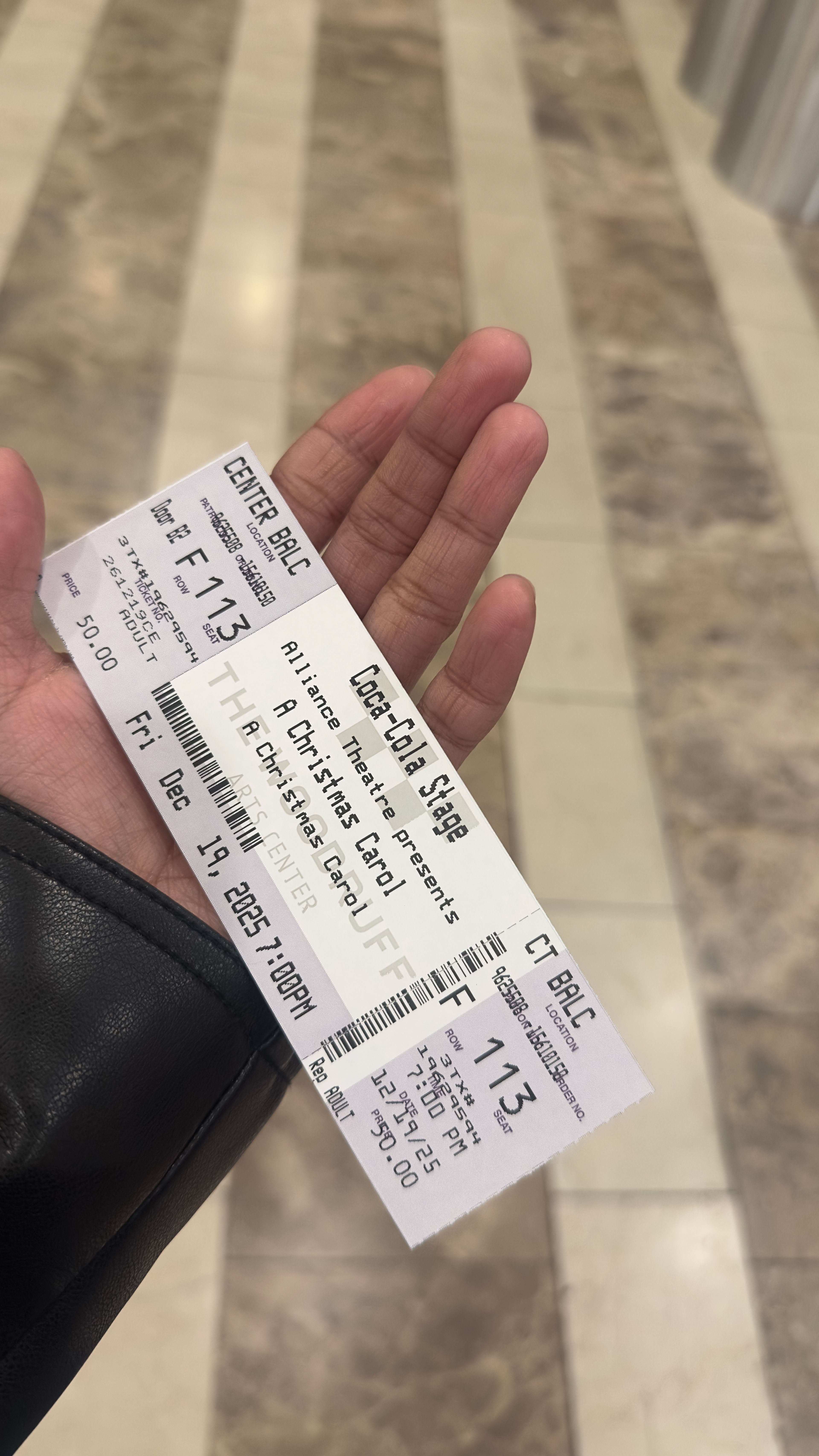 I watched A Christmas Carol on December 19 at the Alliance Theatre in Atlanta, GA, and it was absolutely beautiful. The ambience felt magical, and the design concept was stunning. They built a rotating house whose angles revealed different scenes, creating a seamless visual journey. Snowfall drifted through the space, adding to the enchantment. The production explored every phase of A Christmas Carol—past, present, and future, and when the ghost scenes appeared, the darkness and intensity were so chilling that they gave me goosebumps. Overall, the concept was incredibly thoughtful and immersive, making this A Christmas Carol an experience unlike anything I had ever seen before.